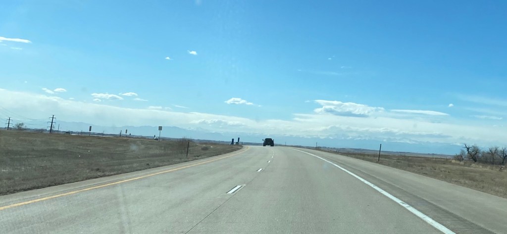 The view of mountains (far, far in the distance) as you drive into Colorado from Nebraska. I promise you, they are there right beneath the clouds.